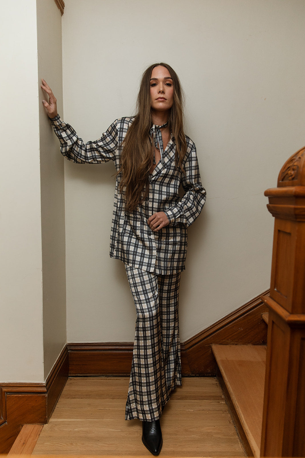 Bobbi is a vintage-inspired menswear lounge shirt designed for a completely effortless chic look. With its relaxed, oversized silhouette, it’s the perfect piece to pair with our Bridget Bells or your favorite vintage denim. The long-sleeve collared blouse features faux glass buttons, and a classic Western yoke on the back, adding a touch of timeless detail to the design.