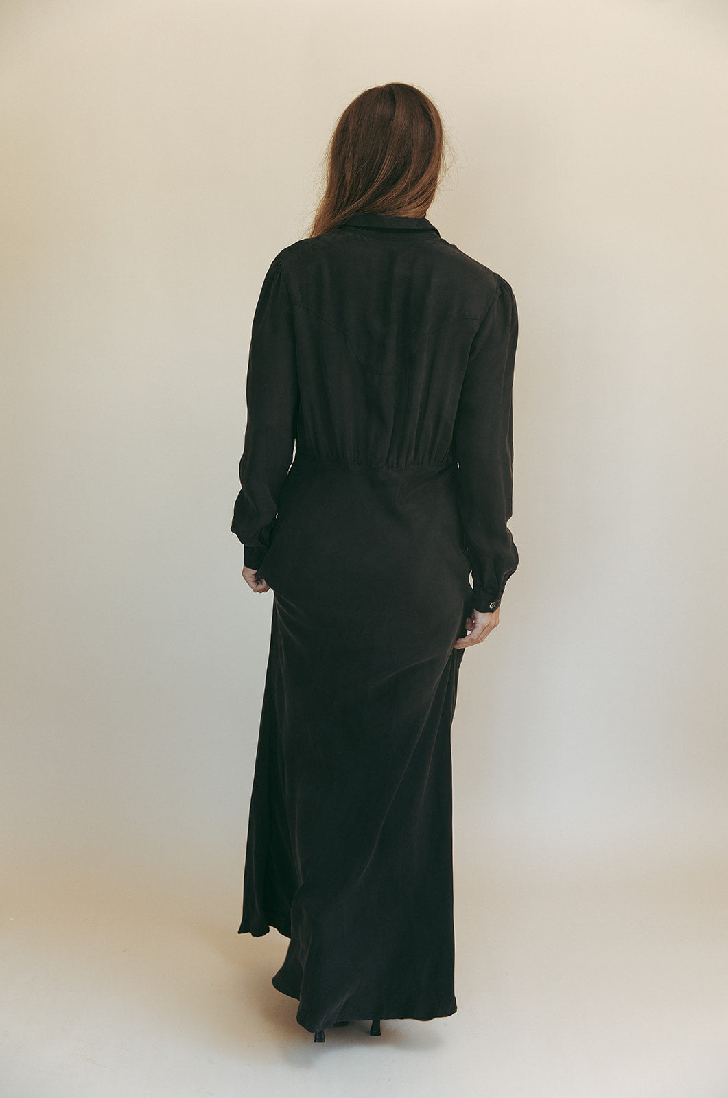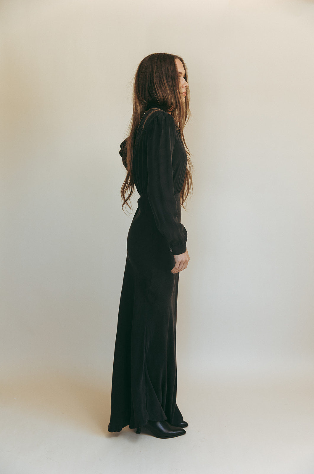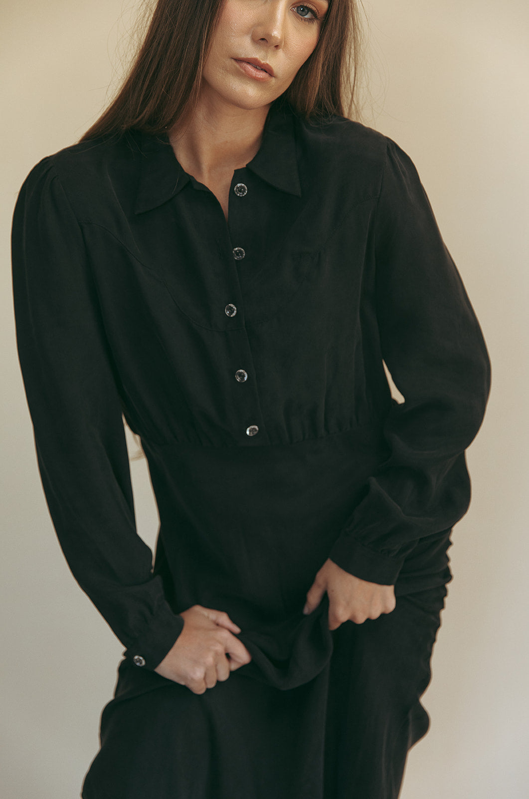 1920s inspired dream dress, the Dahlia, blends timeless elegance with Western charm. The loose-fit silhouette features a delicate collar, long sleeves with subtle puffed shoulders, and a long, flowing skirt cut on the bias for a flattering drape. Soft ruching at the waist adds texture and shape, while our signature feminine Western yoke offers unique detail on the front and back.