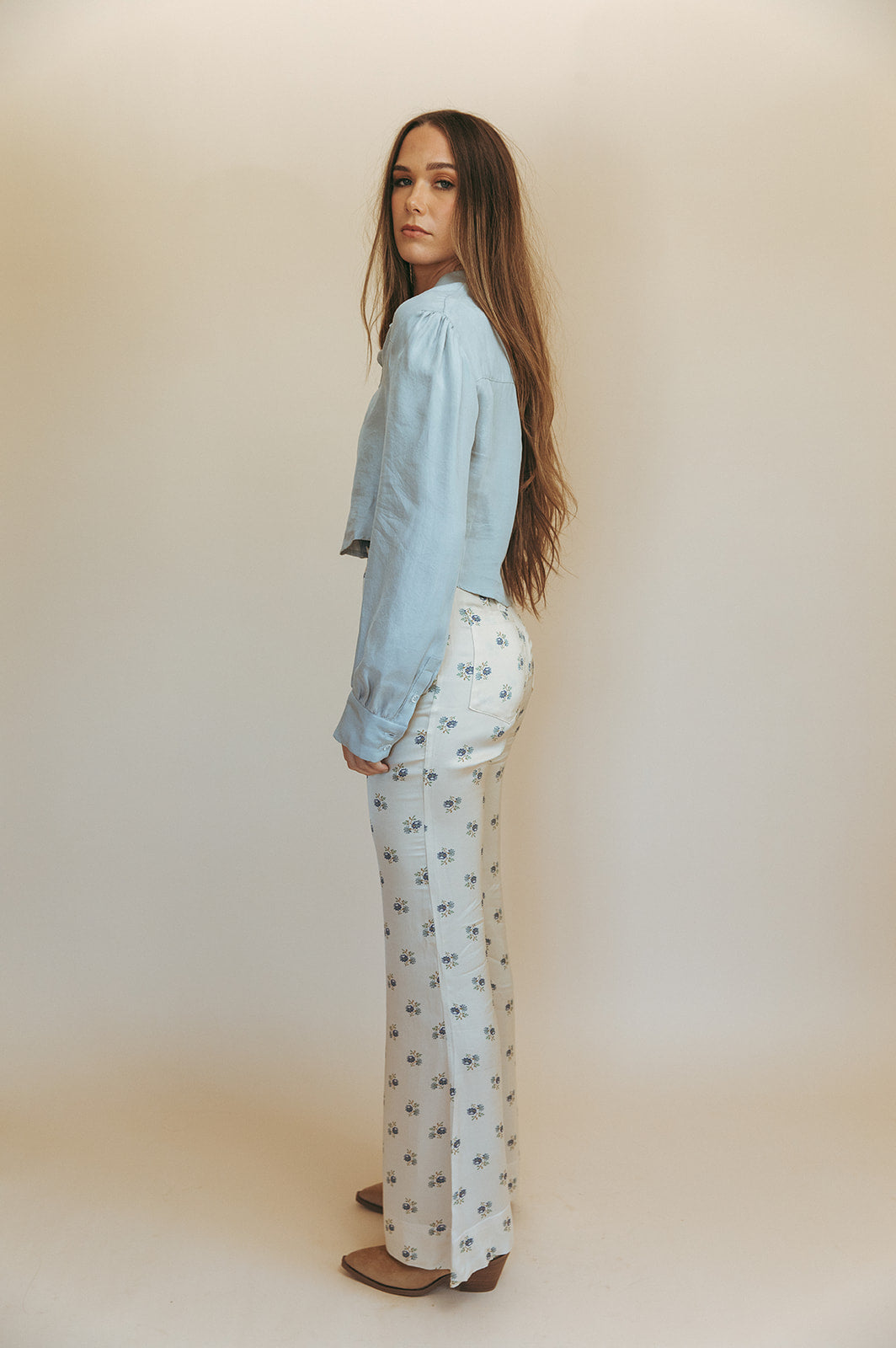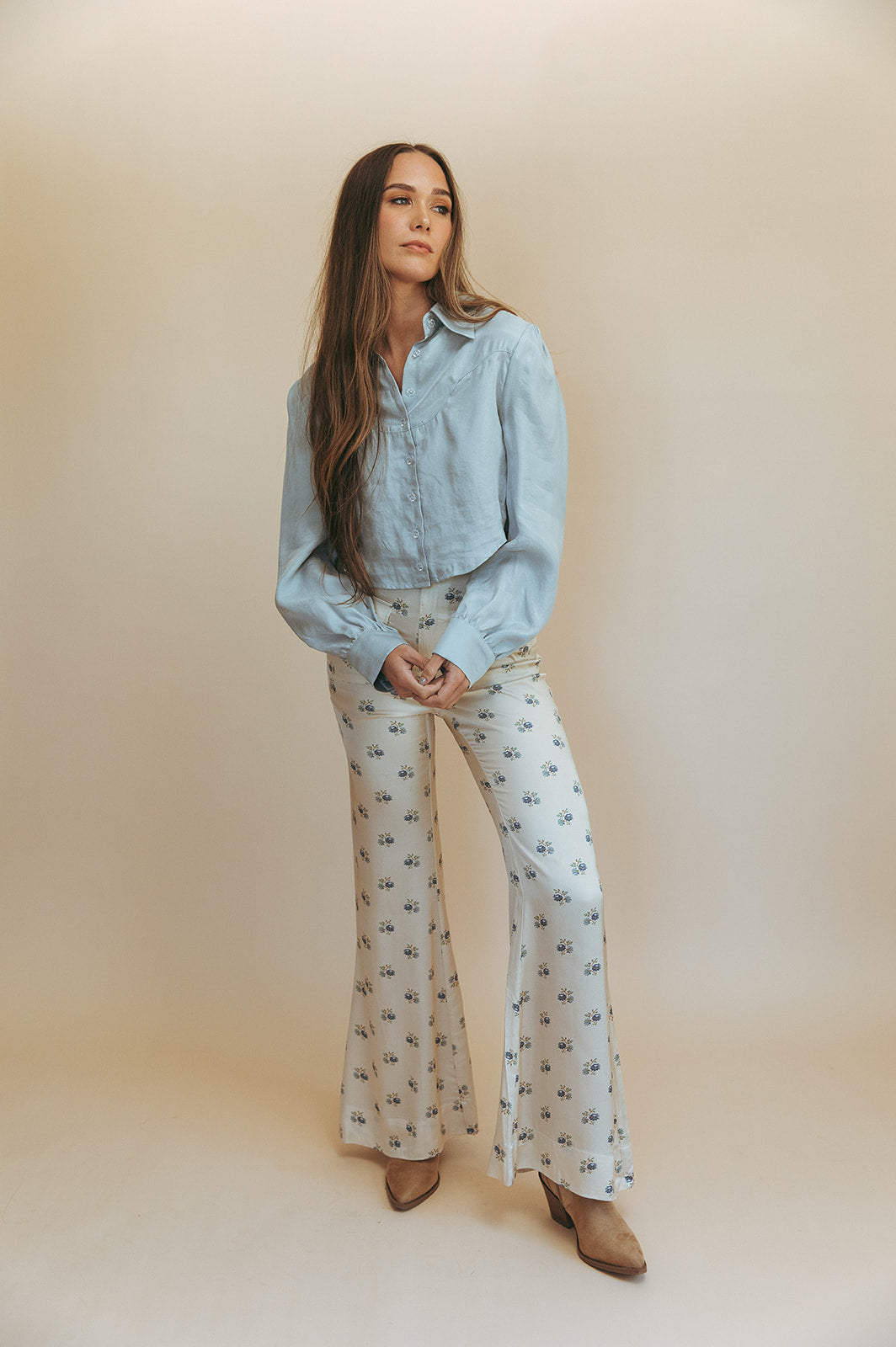 The Marlowe is a chic long-sleeve collared blouse with a flattering curved hem and cropped fit, offering a modern twist on Western-inspired style. Designed with our signature feminine yoke and faux glass buttons, this blouse showcases timeless details. Whether paired with our Bridget Bells, or your favorite vintage denim, the Marlowe effortlessly elevates any look.