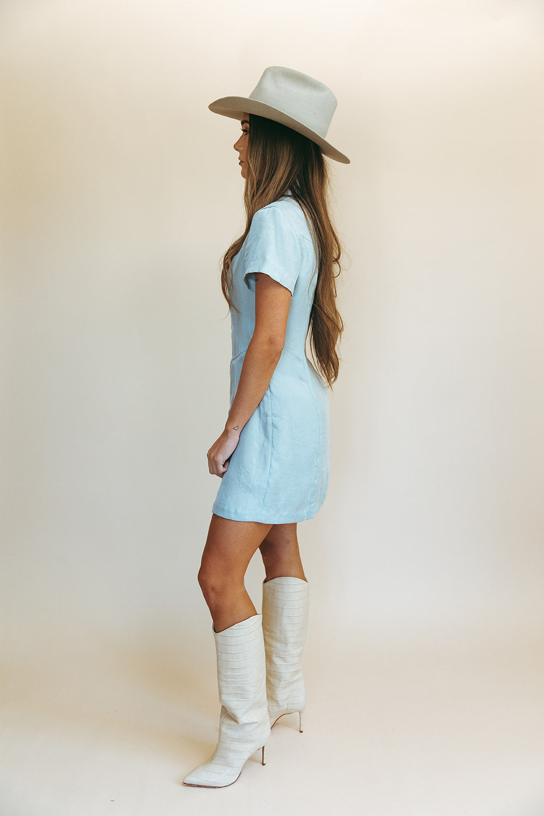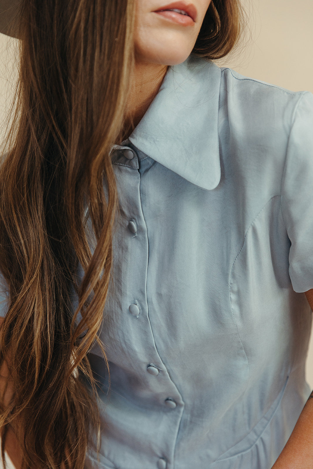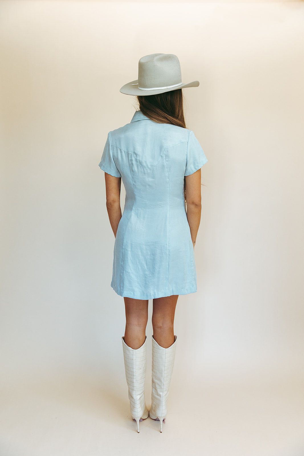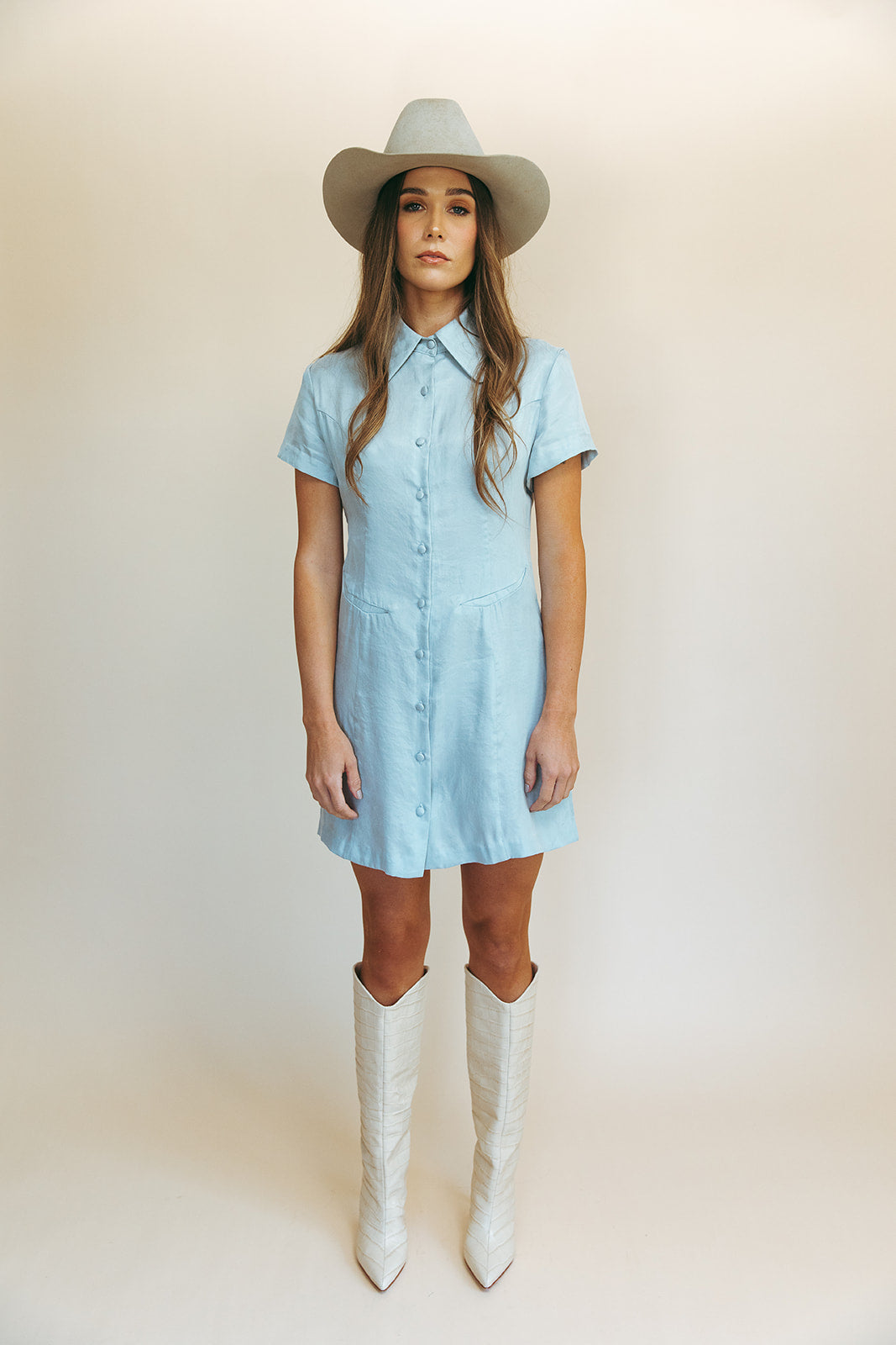 The West channels the spirit of 1960s Western style featuring a classic collar and short sleeves. The playful faux curved moon pockets combined with our signature feminine curved Western yoke enhances the dress with a tailored look. The West is a versatile, standout piece that effortlessly transitions from day to night.