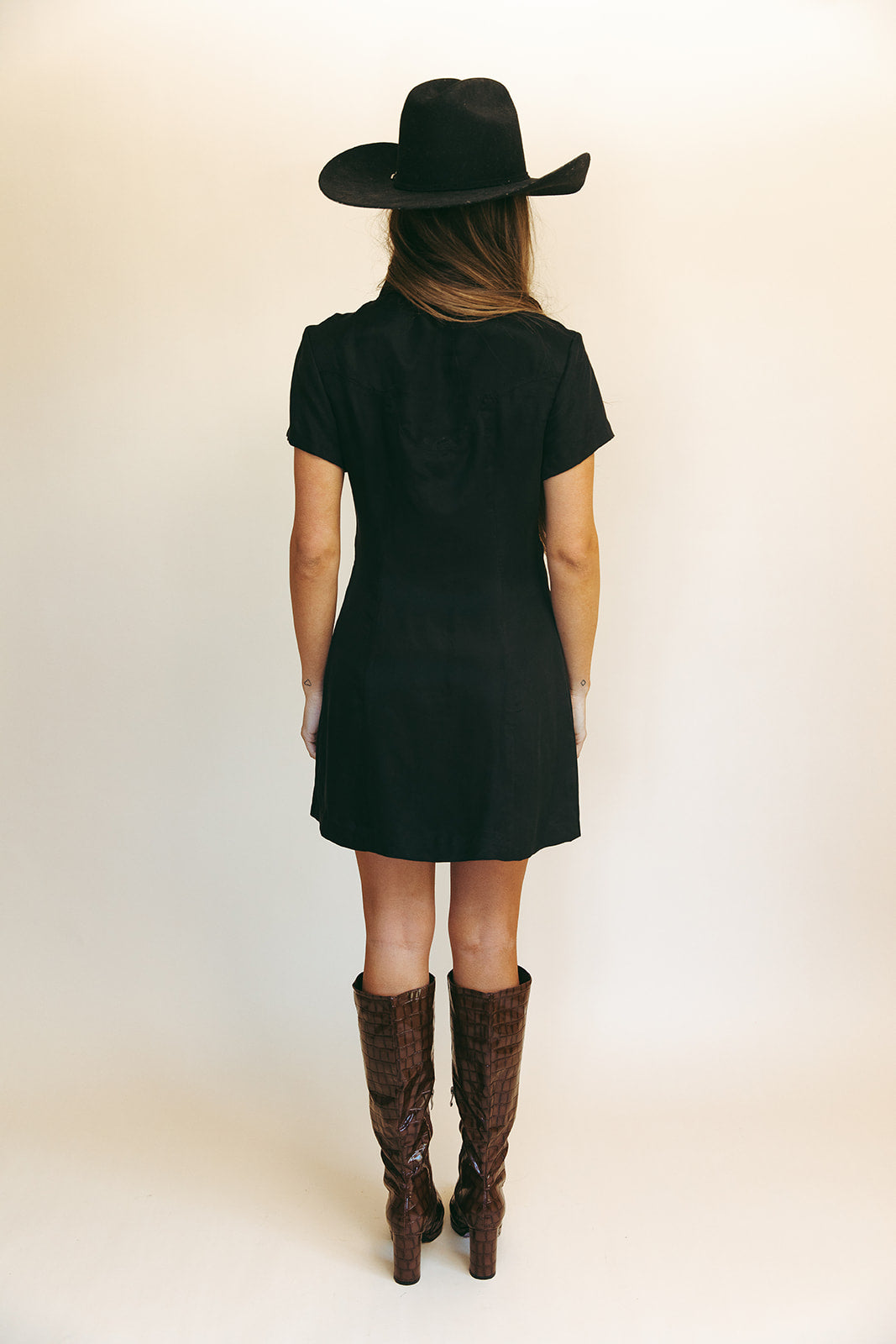The West channels the spirit of 1960s Western style featuring a classic collar and short sleeves. The playful faux curved moon pockets combined with our signature feminine curved Western yoke enhances the dress with a tailored look. The West is a versatile, standout piece that effortlessly transitions from day to night.
